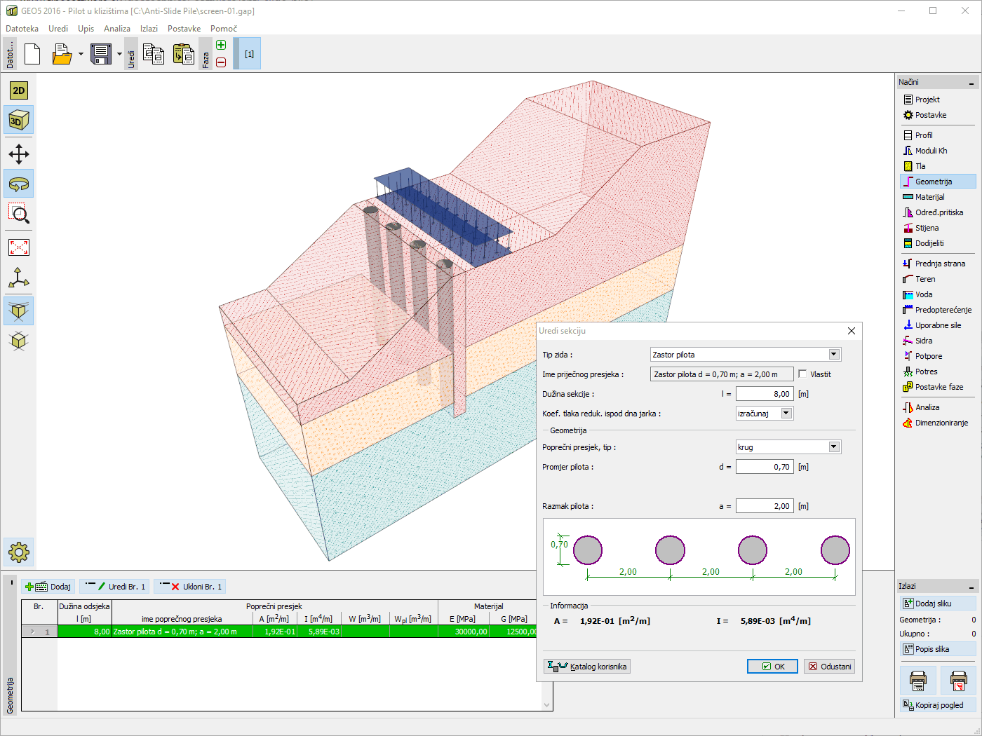 Program Dizajn pilota u klizištima se koristi za oblikovanje pilota i stabilizaciju klizne plohe ili povećanje faktora sigurnosti nagiba. Prva analiza treba biti učinjeno programu Stabilnost kosina, u kojom se izračunavaju elemente aktivnih i pasivnih sila, koje djeluju na pilotni zid. Zatim položaj opterećenja i klizanja prenesemo u program Dizajn pilota u klizištima, gdje se obavlja druge analize (određivanje unutarnjih sila na pilot, deformacije pilota i dimenzioniranje armature pilota).