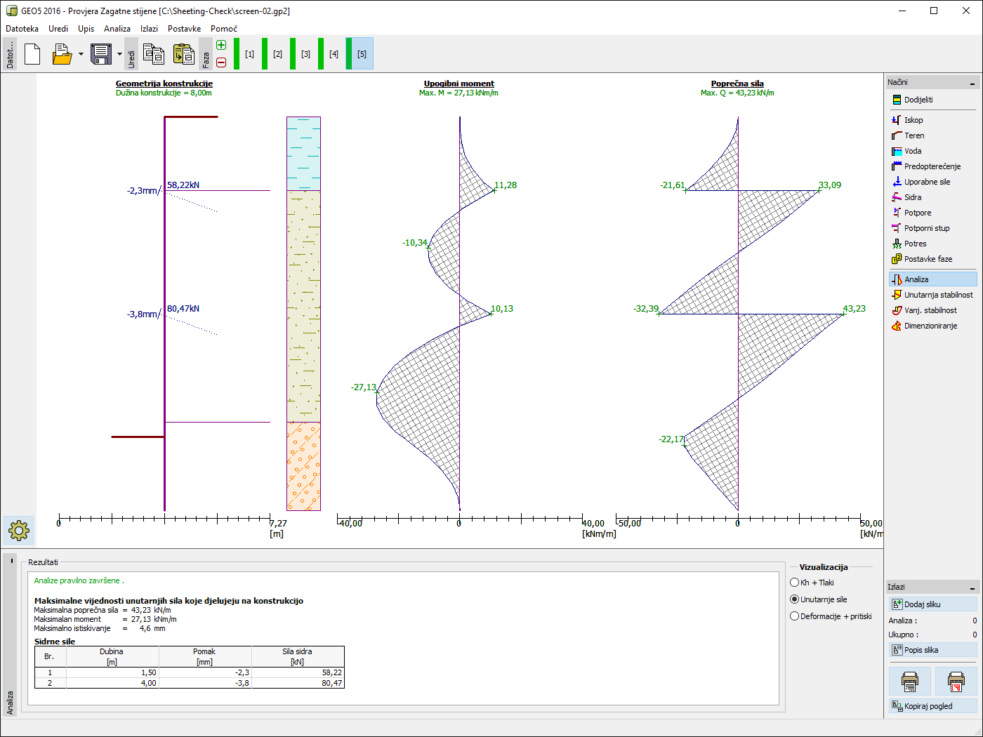 GEO5 program Dizajn zagatne stijene može služiti za osnovno modeliranje proizvoljne duljine konstrukcije u tlu i proračun unutarnjih sila na razini konstrukcije ili poprečnih presjeka.