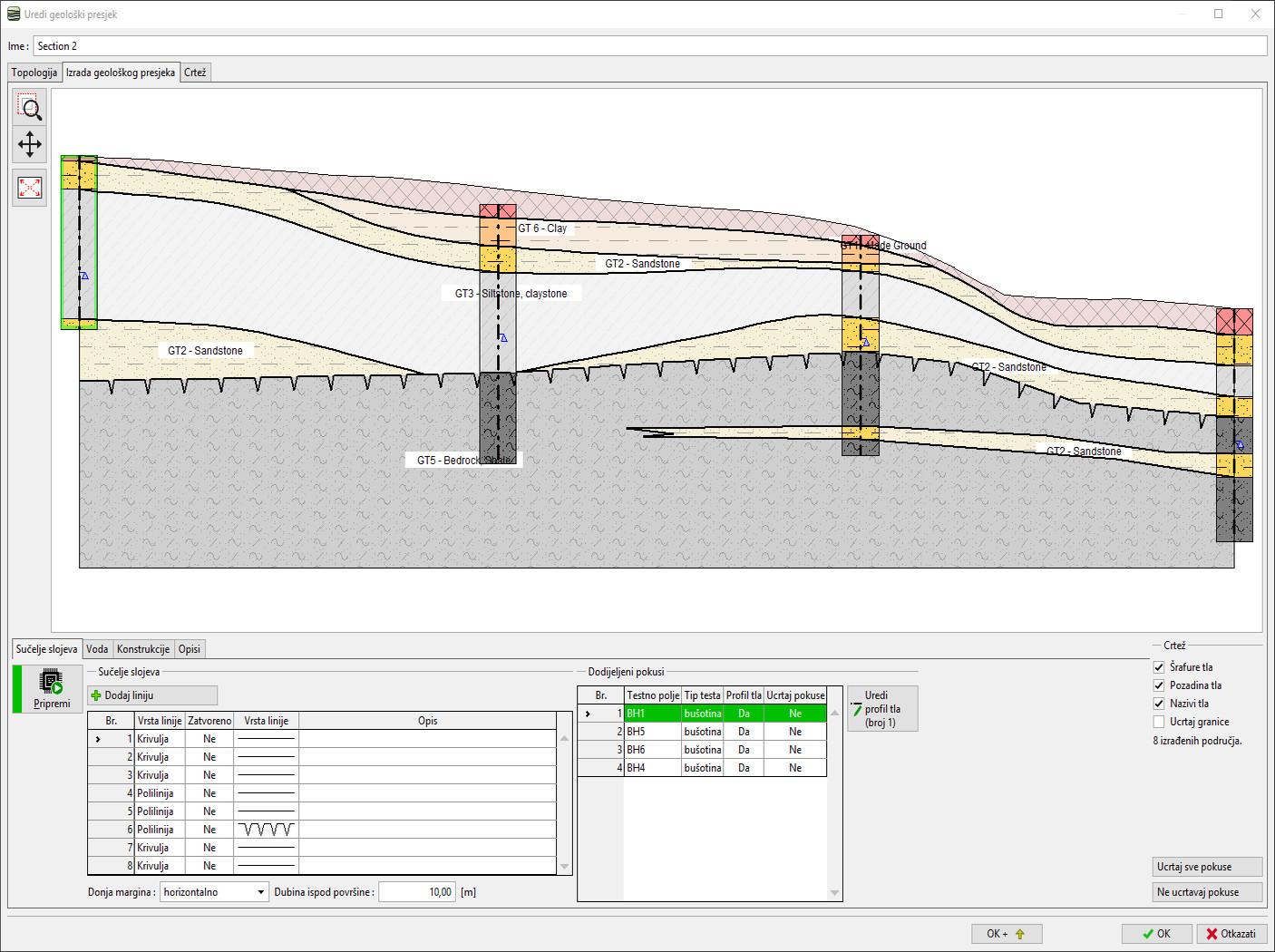 Modul Poprečni presjeci programa Stratigrafija služi za jednostavnu izradu geoloških poprečnih presjeka za podatke dobivene iz ispitivanja gradilišta (bušotine i terenski pokusi). Geološka interpretacija se može prikazati unosom granica između slojeva, rasjeda i povezivanjem bušotina unutar modela – sve to bez ikakve potrebe za dodatnim CAD programima. CAD program nije potreban.